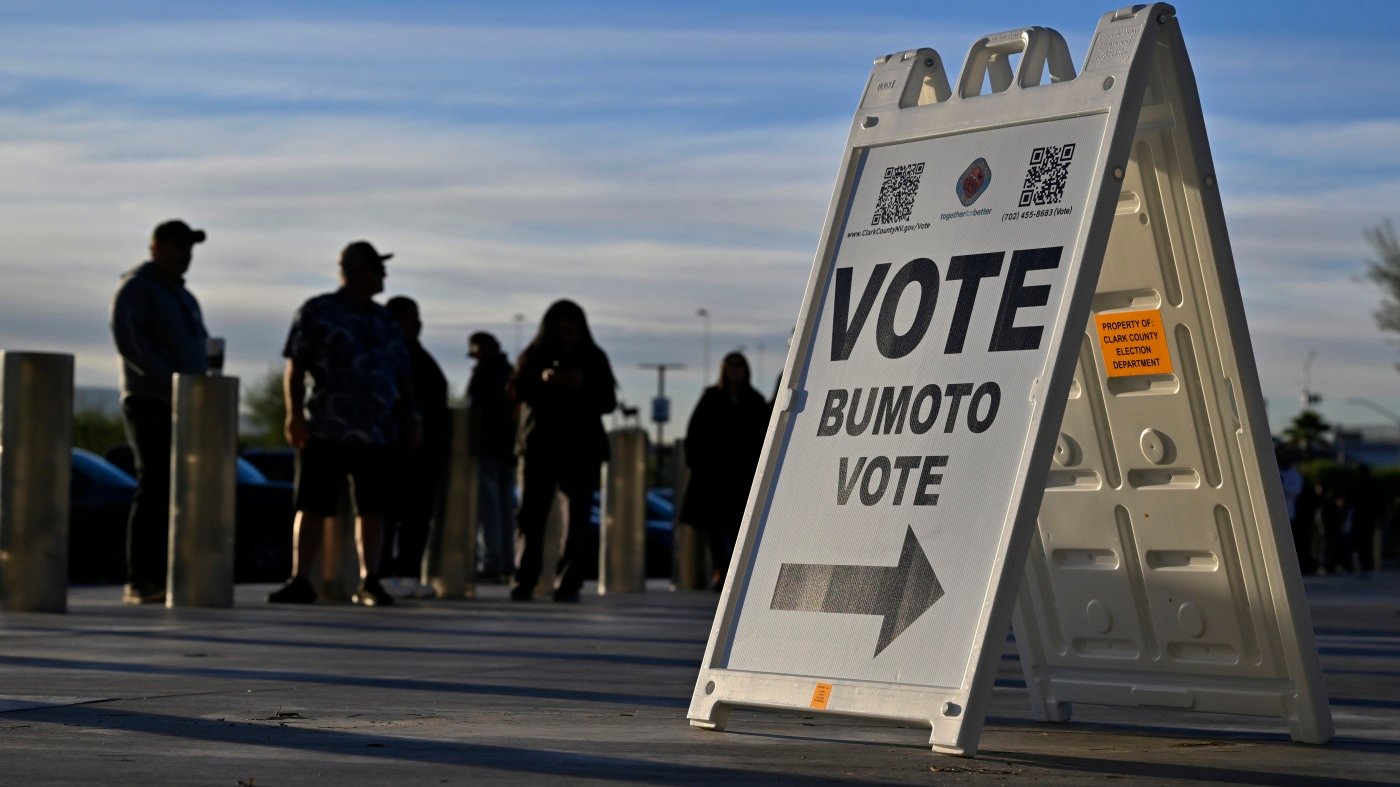 Voters line up to cast their ballots at Allegiant Stadium on Nov. 5, 2024, in Las Vegas, behind a sign reading “Vote, Bumoto, Vote” — directions in English, Tagalog and Spanish.
