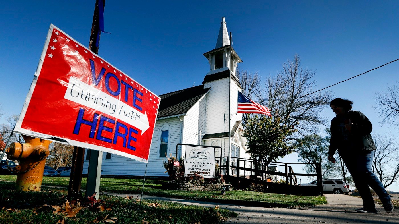 A local resident leaves a church after voting in an election in Cumming, Iowa.