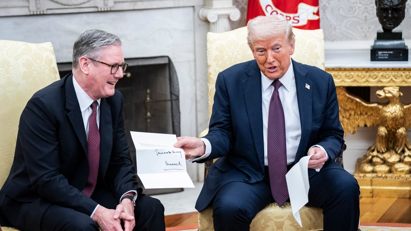 President Trump is given a letter from King Charles III, by British Prime Minister Keir Starmer in the Oval Office at the White House on Feb 27.