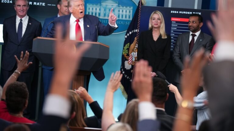 President Trump takes questions from reporters at the White House on August 8, 2025.