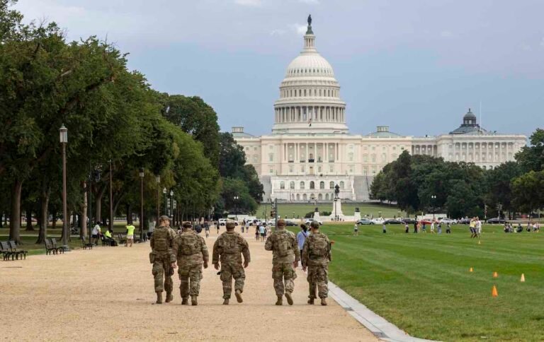 Members of the National Guard walk on the National Mall on August 14, 2025, in Washington, DC, following President Donald Trump’s deployment of federal forces and takeover of the city’s police department.