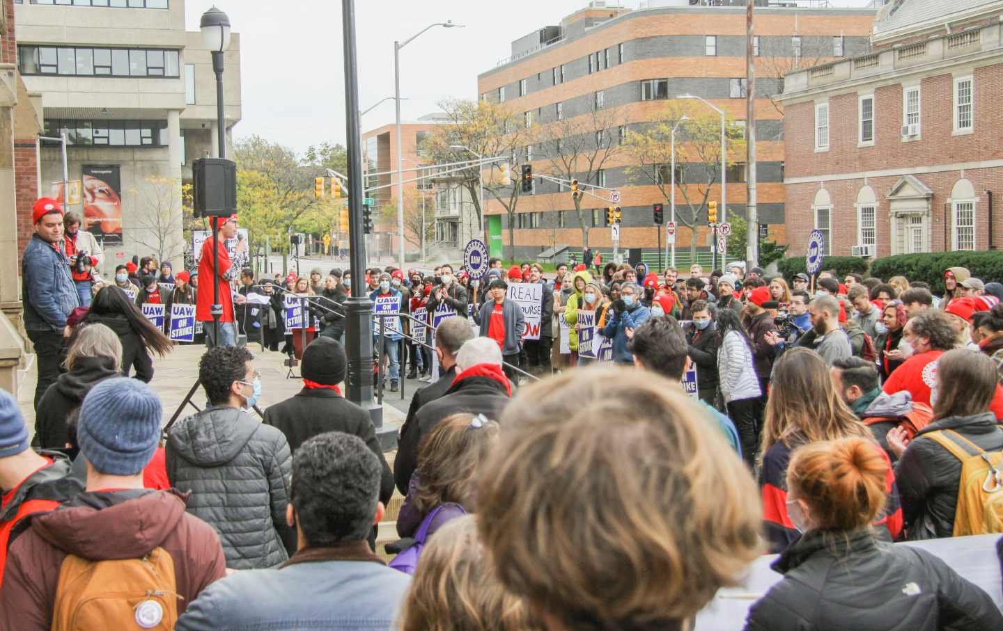 The Harvard Graduate Student Union–United Automobile Workers during a rally in 2021.