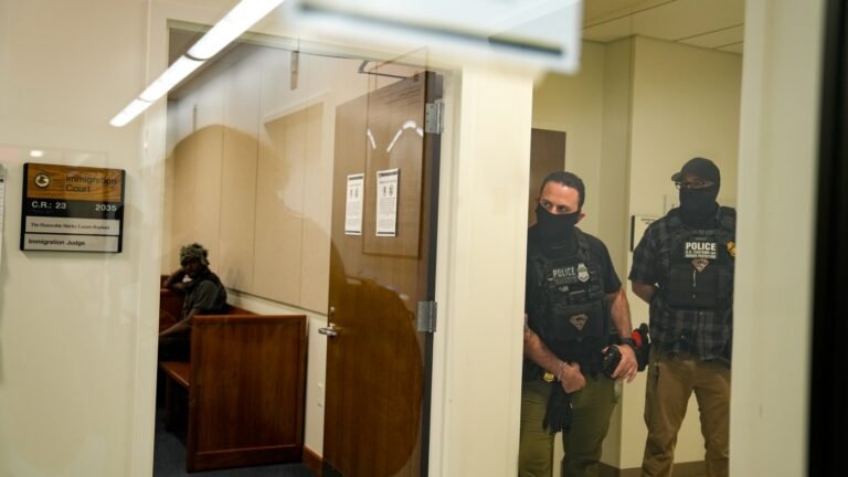 The halls of the immigration courts in lower Manhattan are quiet on a recent August day — except for the sounds of five men wearing masks and sunglasses, looking at their phones and talking among themselves. They are immigration and federal law enforcement officers, continuing the show of force that has thrown immigration courts into chaos.