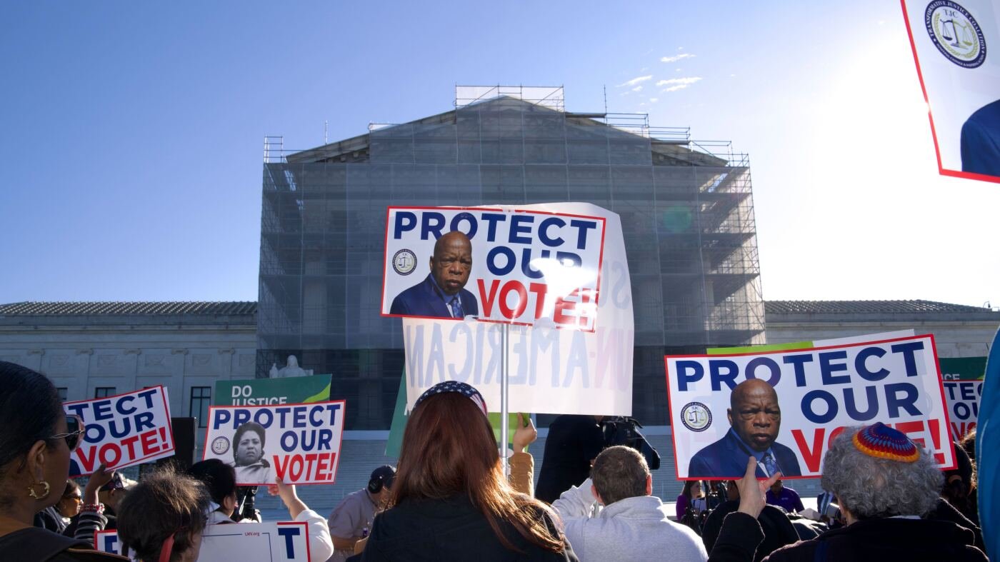 Demonstrators holding signs in support of minority voting rights gather outside the U.S. Supreme Court in Washington, D.C., on Wednesday.