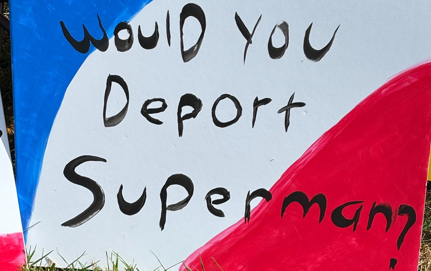 Brewster, NY—I saw no Antifa. I did see AMPHIFA: a woman dressed as a frog waving a flag and a sign proclaiming “Amphibians Against Fascism.” I saw unicorns and more frogs, an older woman riding a blow-up horse, a bunch of kids fascinated by her horse, and a handsome immigrant Superman (a family-practice doctor in Ossining) carrying a sign asking, “Would you deport Superman?” (That’s a hard no, from me.)