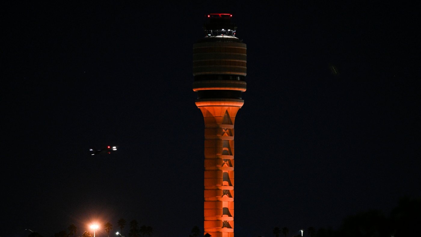 The air traffic control tower is seen at Orlando International Airport in Orlando, Florida early morning on Oct. 31. Flights at Orlando International Airport faced major delays on Oct. 30, after the Federal Aviation Administration said the airport had no certified air-traffic controllers in its tower, forcing arrivals to be halted or severely delayed amid the ongoing US government shutdown.