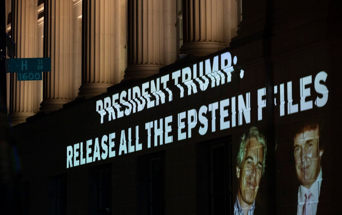 A projection onto a building near the White House demands that Donald Trump release the Epstein files in July 2025.