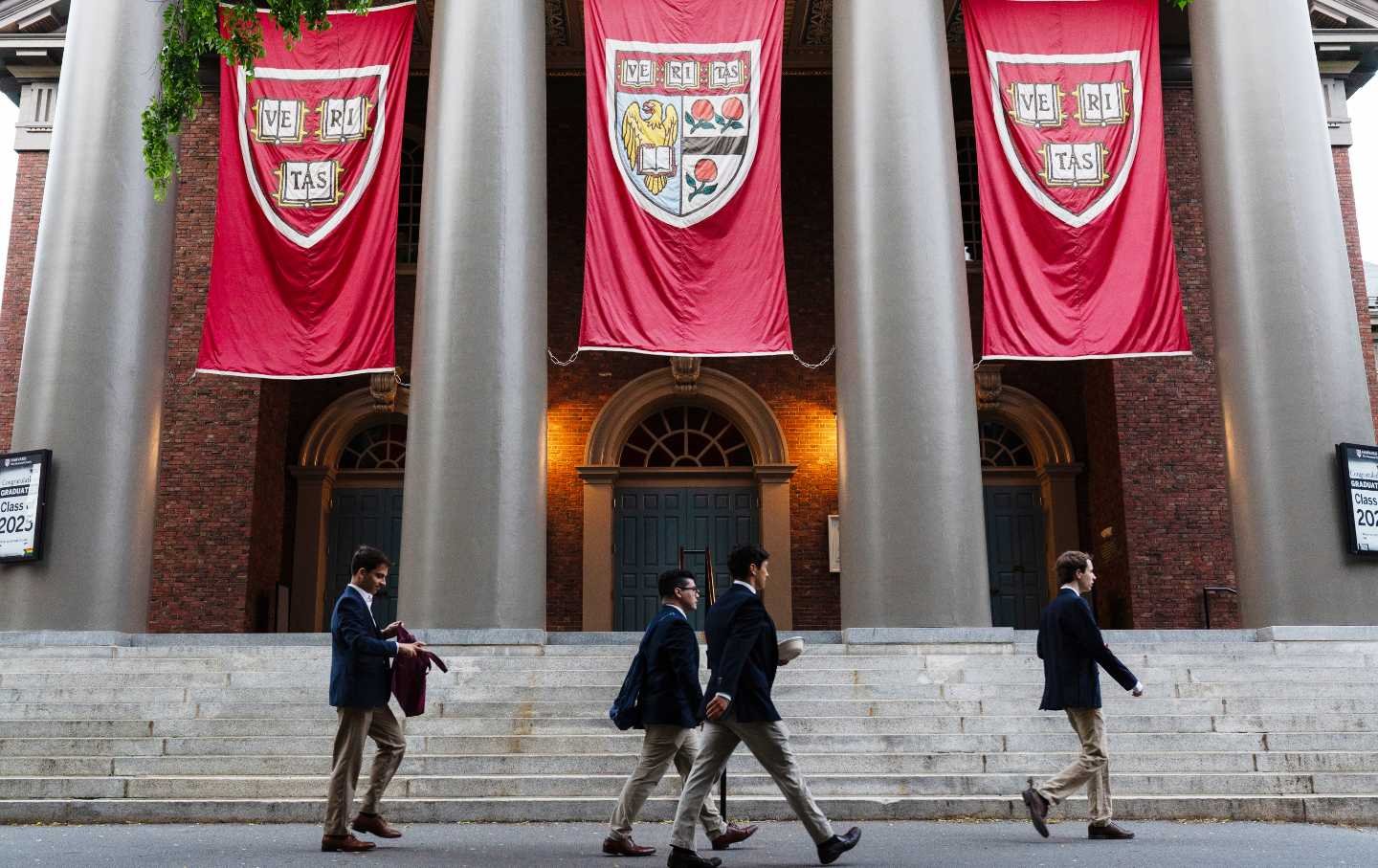 Banners hanging from Memorial Church on the Harvard University campus in Cambridge, Massachusetts.