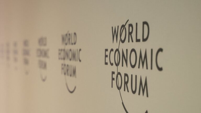 This photograph, taken on Jan. 20, 2026, shows the logo of the World Economic Forum in the Alpine resort of Davos. The World Economic Forum takes place in Davos from Jan. 19 to Jan. 23, 2026.