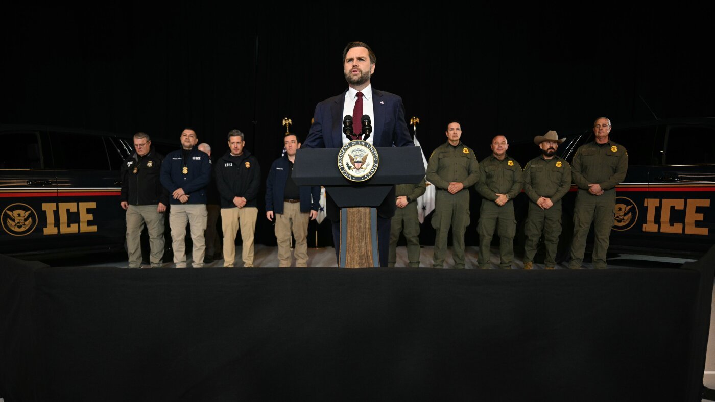 Vice President Vance gives remarks while standing in front of ICE agents following a roundtable discussion with local leaders and community members amid a surge of federal immigration authorities in Minneapolis, Minnesota.